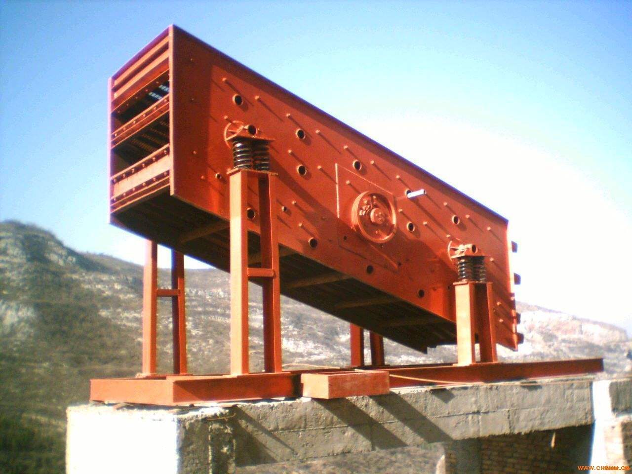 直線振動(dòng)篩由機(jī) 座、參振兩部份組成,振動(dòng)電機(jī)安裝在直線篩的長(zhǎng)方形篩架兩側(cè),通過(guò)彈性橡膠連接產(chǎn)生振動(dòng),調(diào)節(jié)振動(dòng)電機(jī)內(nèi)和重塊相位角,可以提高振幅和激 振力,所以,直線篩可以單層或多層使用。